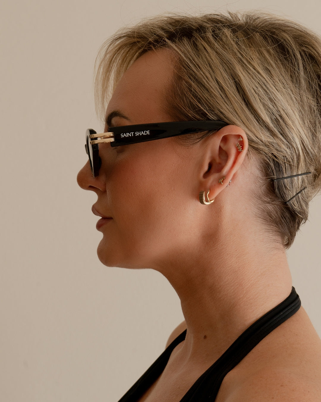Channeling vintage allure with a contemporary edge, The Bridget is effortlessly chic and bold. Their striking cat-eye shape is accentuated by gold-tone hardware, adding a touch of opulence to the sleek black frames. Available in black & pink.